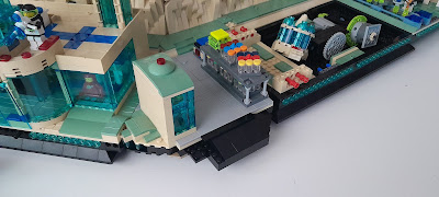 At the top is another 1 x 2 Technic brick to pass a wire to the front side. This wire will be used to light up the second floor. The wire will have to be concealed behind the rock work.