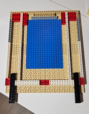 In this post, I showed a prototype of the door mechanism. The total depth needed is 3 studs. The door takes up one stud width, which will accommodate the plate and tile thickness of the door. One stud width is needed for the support wall that contains the driving gear. Finally one stud width for the final gearing mechanism, that contains the work drive.